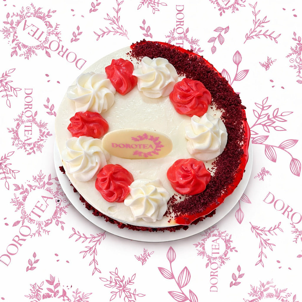 Cocoa roja, decorado con betún de queso, macarrón, topping de corazones rosas y blancos, Delicioso